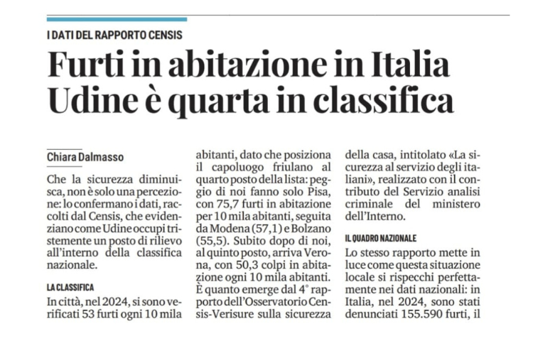 Udine – Per anni il Friuli Venezia Giulia è stato percepito come una terra sicura, dove i furti in abitazione erano rari. Oggi i dati raccontano un’altra realtà: secondo il Messaggero Veneto (articolo di oggi, 30 ottobre 20205), su elaborazione Censis, Udine è quarta in Italia per furti in casa con 53 episodi ogni 10.000 […]